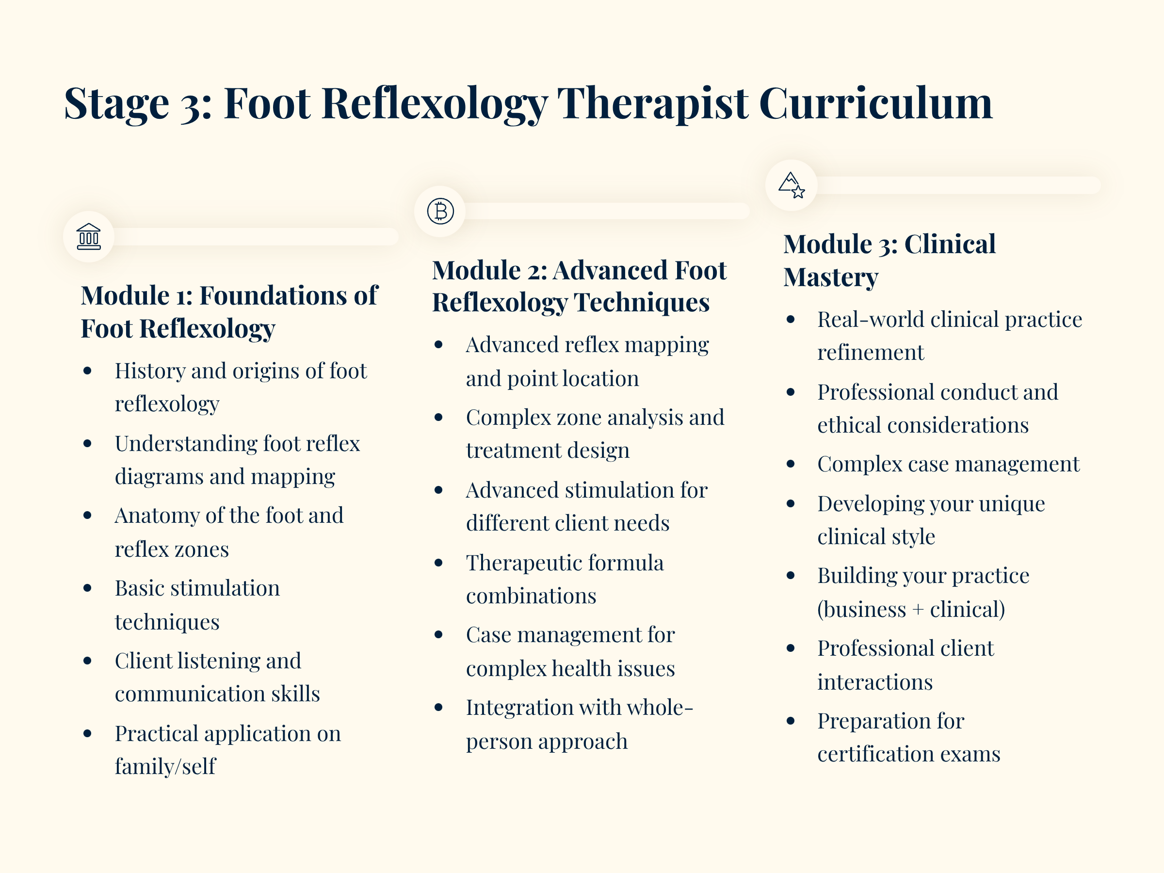 - Foot Reflexology modules contain three possible learning components. Recorded content, live virtual classes.