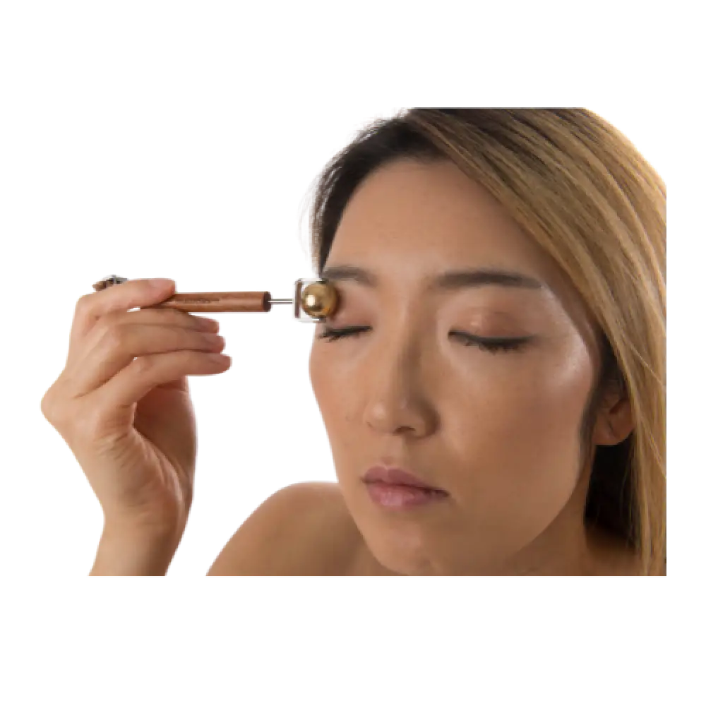 After contouring with the yang end, switch to the yin brass ball. Roll gently around the orbital bone (eye area) and along the jawline with light pressure. The yin disperses excess fluid that creates puffiness, leaving your face looking refreshed and sculpted.