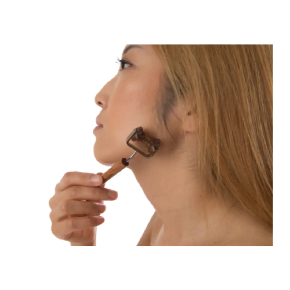 Use the yang concave end with short strokes following the natural contours of your face. Start at your jawline, rolling upward and outward toward your ears. Move to your cheekbones, rolling from the center of your face outward toward your temples. Work your neck by rolling upward from the collarbones. Each stroke should lift and define.