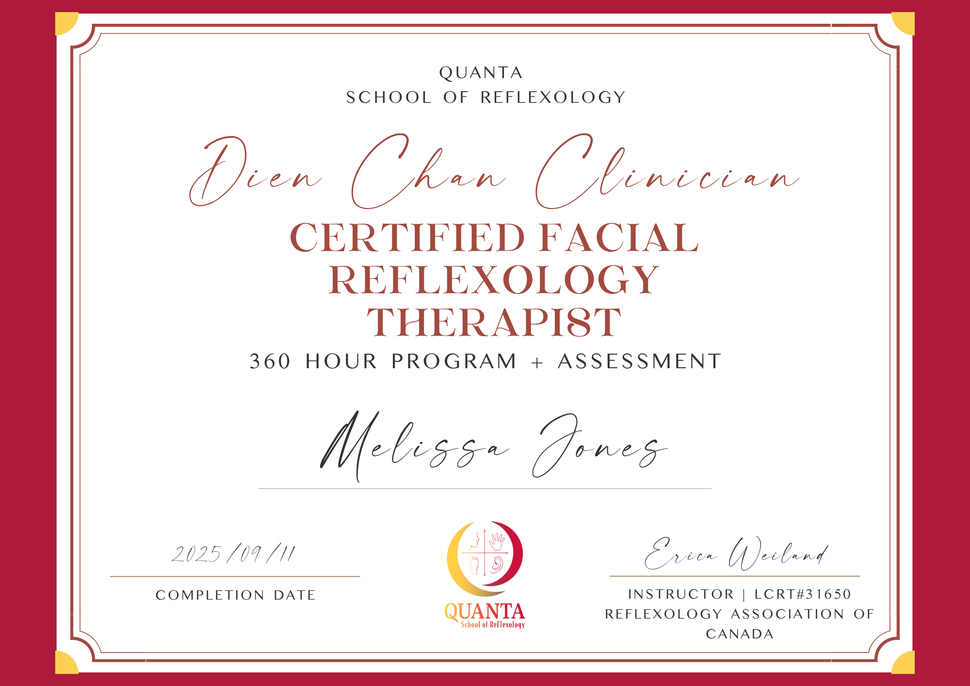 Dien Chan Clinician Facial Reflexology has been an eye-opening experience. I found relief and healing in ways I never thought possible for myself and my clients, but I've also gained invaluable insight into how interconnected our body truly is. The journey so far has been transformative, there is so much more to learn and explore. Each session I work with the method feels like uncovering a new layer of understanding, and I can't wait to continue deepening my knowledge and healing with this practice.